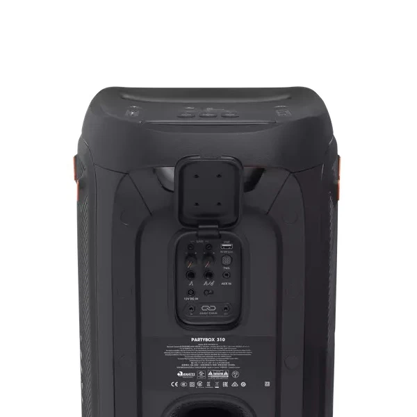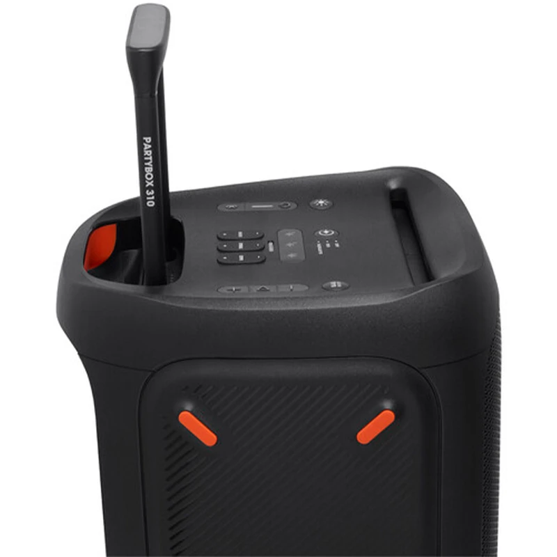 اسپیکر بلوتوثی پارتی باکس 310 یکی از جدیدترین محصولات کمپانی جی بی ال است که با مجهز بودن به درایورهای حرفهای، برای استفاده در محیطهای بزرگ عالی عمل میکند. پارتی باکس JBL 310 با ویژگیهای مثبتی چون قابلیت اتصال به بلوتوث، رقص نور خیرهکننده هماهنگ با موسیقی، باتری پرقدرت و قابلیت حمل آسان در میدان بسیار خوش درخشیده است. با توان خروجی بالا و باس قویای که این اسپیکر دارد، موسیقی را با کیفیت بالا پخش میکند. این اسپیکر حرفهای پرتابل از اتصالات مختلفی مانند بلوتوث، پورت USBو ورودی AUX پشتیبانی میکند و قابلیت کار هم با شبکه برق و هم با باتری را داراست. ناگفته نماند که قیمت جی بی ال ۳۱۰ با داشتن این ویژگیها بسیار مناسب است. عملکرد اسپیکر بلوتوثی جی بی ال 310 در انواع موسیقی کمنظیر است. با وجود قابلیت تنظیمات EQ متعددی هم که در آن وجود دارد، تجربه فوقالعاده از پخش موسیقی را برای شما فراهم میکند. باتری اسپیکر پارتی باکس ۳۱۰ عملکرد فوقالعادهای دارد به طوری که طی 3 ساعت شارژ شده و میتواند تا ۱۷ ساعت موسیقی پخش کند. البته میزان مصرف باتری این محصول به نوع موسیقی و بلندی حجم صدا هم بستگی دارد. نکته جالب اینجاست که این بلندگو به اسپیکر مشابه هم وصل میشود و با این کار حجم صدای موسیقی بیشتر شده و محدودهی پوشش صدا افزایش مییابد. شرکت سازنده در اسپیکر PartyBox 310 پورت ورودی میکروفون هم در نظر گرفته تا برای اجرا یا گفتوگو هیچ مشکلی نداشته باشید. علاوه بر ورودی میکروفون، دکمه تنظیم ساز گیتار هم در این بلندگو تعبیه شده تا برای اجرا زنده هم بسیار کاربردی باشد.
