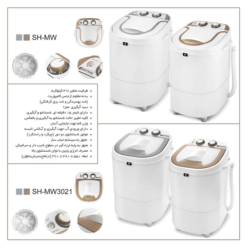 مینی واش SH-MW3021 به دلیل ابعاد جمعوجور و وزن سبک، انتخابی عالی برای فضاهای کوچک مانند آپارتمانها، خوابگاهها و خانههای دانشجویی است.